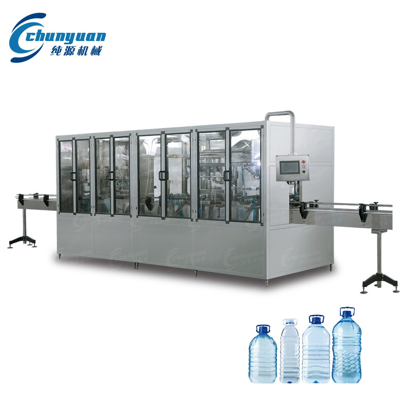 純源機械廠家供應的一加侖直線式灌裝機是專供3升、4升、5升、6升塑料瓶,桶清洗、灌裝、封蓋的生產設備。主要用于純凈水、飲用水、礦泉水的灌裝。一加侖直線式灌裝機集沖洗灌裝封蓋于一體,特點是穩定的生產能力,結構簡單,易于操作。