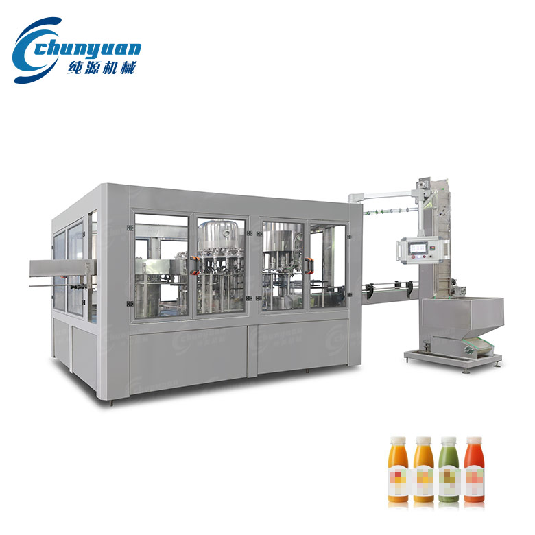 純源機械廠家生產制造的全自動果蔬汁飲料灌裝機集沖洗、灌裝、旋蓋于一體,主要適用于果汁、果蔬汁、橙汁、酵素等的熱灌裝。