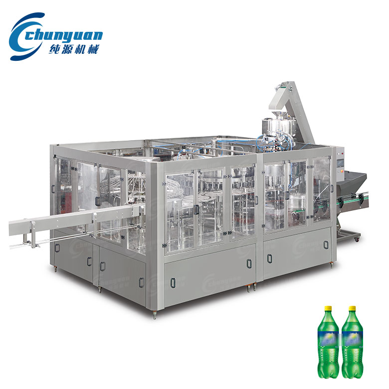 純源機械廠家供應的雪碧含汽飲料機械集沖洗、灌裝、旋蓋于一體,適用于灌裝雪碧、可樂、碳酸飲料、含汽蘇打水等含汽飲料的聚酯瓶灌裝,全過程實現自動化。